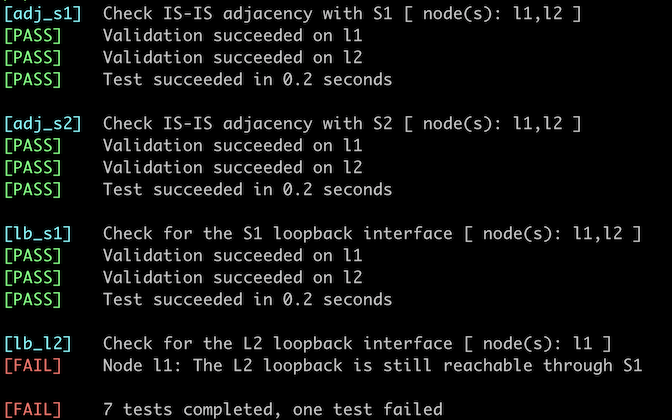 You can use the netlab validate command if you’re using netlab release 1.8.4 or later and run FRRouting on L1 and L2. This is the printout you’d get if you failed to configure the overload bit: