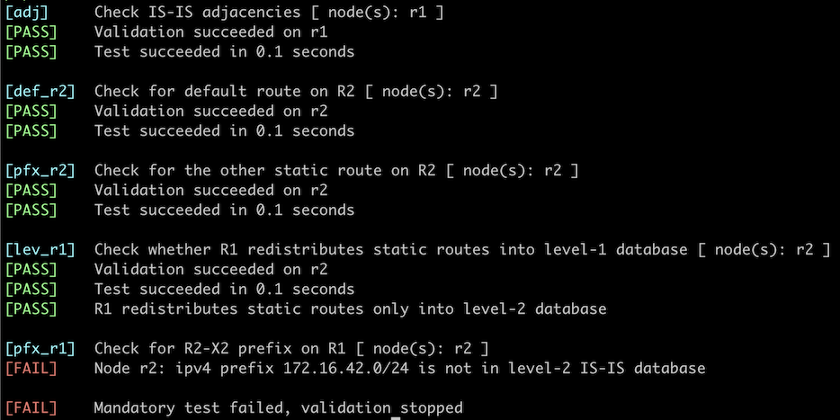 You can use the netlab validate command when using FRRouting on R1 and R2. This is the printout you’d get after configuring default route redistribution on R1 while forgetting the redistribution of connected interfaces on R2.